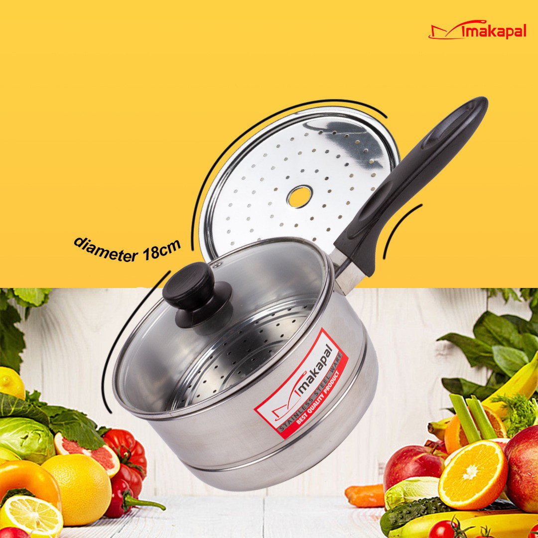 Panci Susu Steamer Makapal 18 cm-Model Terkini-Dilengkapi dengan steamer/kukusan-Bahan High Quality Stainless Steel-Aman untuk memasak-Dilengkapi dengan tutup kaca untuk mempercepat proses memasak-Ukuran Lengkap diameter 16cm s/d 20cm-Sudut pegangan ergo