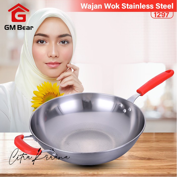 GM Bear Wajan Wok Stainless Steel D32cm 1297 - Wok Stainless SteelGM Bear Wajan Wok Stainless Steel Wajan Penggorengan Wok Gagang merah. Sangat cocok digunakan untuk memasak dalam skala besar. Dengan bahan stainless steel anti lengket cocok digunakan untuk menggoreng dan menumis makanan. Tidak perlu takut makanan tidak matang sempurna karena wajan ini panasnya merata.Bahan stainless steel tebal, kuat, tahan lama, berkapasitas besar. Wajan ini juga sangat mudah dibersihkan.Sebelum penggunaan, cuci alat masak anda dengan air hangat dengan sabun ringan atau deterjen khusus alat masak, bilas dan lap hingga kering menggunakan handuk lembut. Spesifikasi Produk :Diameter : 32 cmWarna : Silver, gagang merahBahan : Stainles steel tebalIsi dalam paket : 1pcs wajan 32cmDe Essential merupakan distributor resmi GM BearHarap pastikan pesanan yang Anda terima sudah sesuai, sebelum menyelesaikan pesanan (retur hanya dapat dilakukan sebelum pesanan diselesai