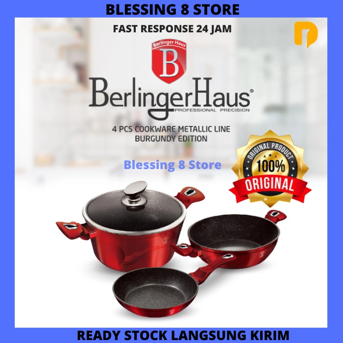 READY SIAP KIRIMBerlinger Haus 4 pcs Cookware Metallic Line Burgundy dan Line Carbon Edition100% OriginalPanci berkualitas dengan material premium. Dengan warna yang elegan menjadikan seri panci Berlinger ini tampak mewah di dapur Anda. Lengkapi koleksi Berlinger Haus Anda dengan seri panci terbaru ini.1 set terdiri dari:- Fry Pan Uk. 24*4,8 cm Kapasitas: 1,7 L- Casserole dengan Tutup Kaca Uk. 24*11,8 cm Kapasitas: 4,1 L- Shallow pot Uk. 24*6,5 cm Kapasitas: 2,3 LKeunggulan Produk:- 3 Lapisan Marble Coating- Pegangan yang ergonomis dan nyaman digenggam- Induction bottom sehingga dapat memasak di kompor jenis apapun, termasuk kompor Indusksi- Material Forged Alumunium- Design yang elegan dengan warna metallic- Material ramah ling