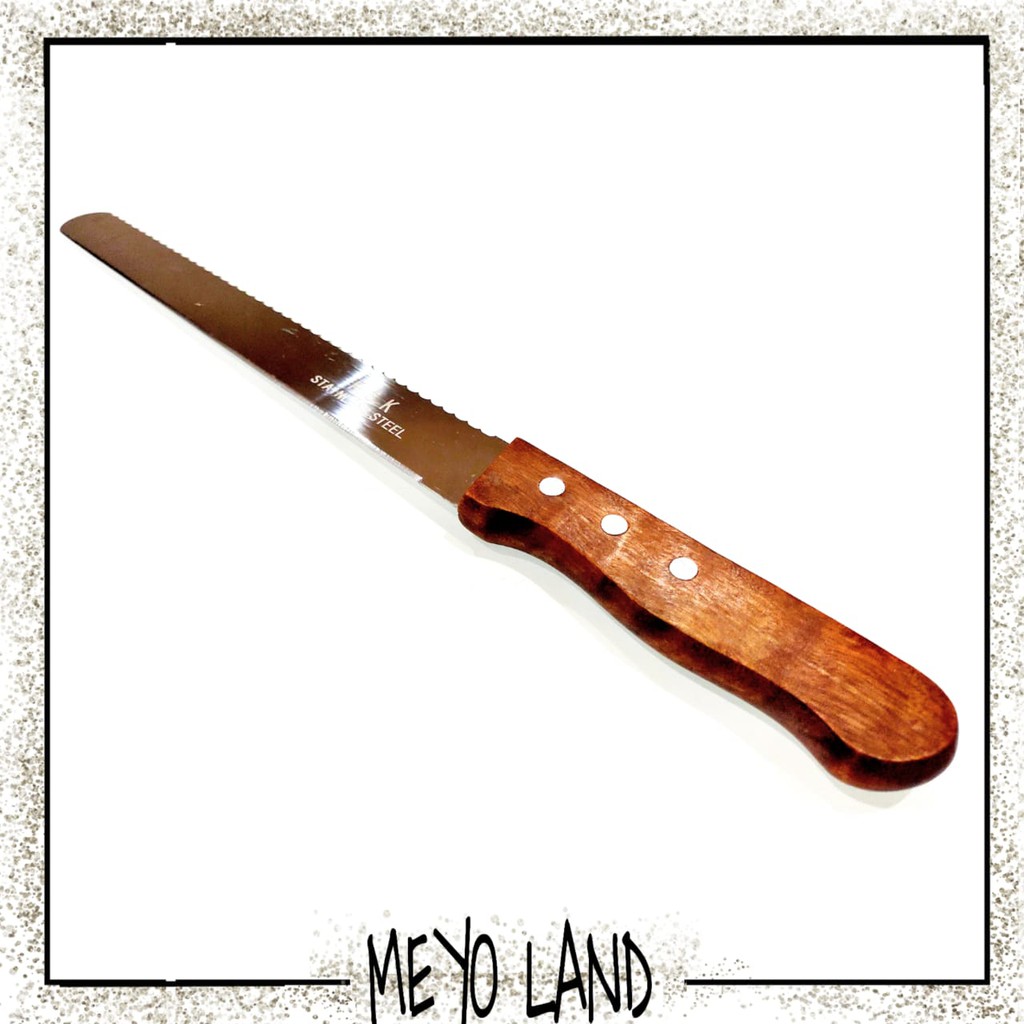 Fungsi : Pisau Pemotong Roti dengan 2 sisi mata pisau (bergerigi dan rata)Dimensi Produk :Panjang Keseluruhan : 37 cmPanjang Mata Pisau : 10”/ 25 cmLebar : 2.5 cmBahan Mata Pisau : Stainless SteelBahan Gagang : Kayu