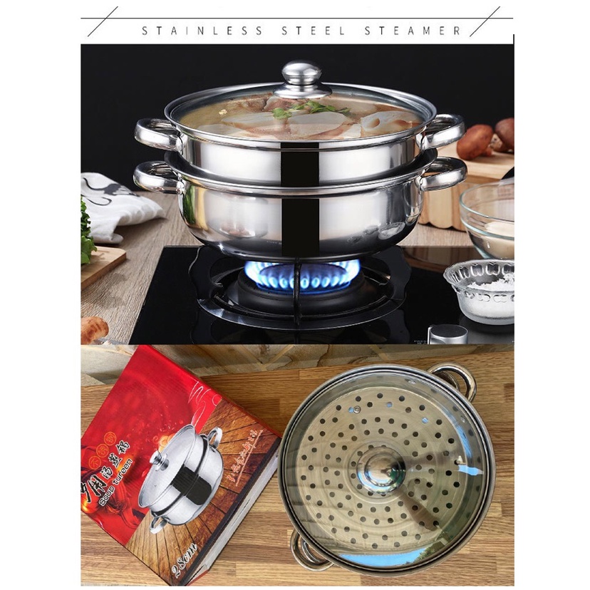 Steamer Stainless 2 Tingkat - Steamer Stainless Steel Kualitas Makin Tebal Diameter 28 CMbisa digunakan untuk merebus makanan dan mengkukus makanan, Dengan design 2 tingkat, bisa dipakai sekaligus untuk merebus makanan dan mengkukus makanan dalam waktu bersamaan. Menggunakan material Stainless Steel (Food Grade Quality), nggak perlu khawatir lagi soal kehigenisan makanan.Tahukah anda bahwa mengkukus makanan adalah cara memasak yang paling baik untuk menjaga kadar nutrisi didalam makanan? Tunggu apa lagi, langsung order Steamer Stainless 2 Tingkat Kelengkapan Produk :• 1 Pcs Tutup Kuali • 1 Pcs Kuali • 1 Pcs Tatakan Steamer • Dimensi Produk : 28 x 28 x 10 cmHappy Shoppi