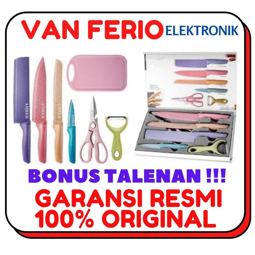AMBER KITCHEN KNIFE 7IN1 MULTICOLOR Set pisau serbaguna yang terbuat dari bahan stainless steel non stick coating Cocok untuk di gunakan di rumah tangga ataupun dijadikan hadiah untuk keluarga terdekat atau orang kesayangan anda. 1 set terdiri dari 6 pisau dengan warna kombinasi (tidak bisa pilih 1 warna karena sudah 1 set) dan 1 Serutan.Spesifikasi :- 6 Pcs Pisau Set + FREE TALENAN= 7 unit- Pisau di lapisi anti lengket- Sangat tajam- Dilengkapi peller- Kualitas Stainless anti karat- Desain EleganIsi Produk :1pc pisau besar/ panjang= 31cm1pc pisau kecil/ panjang= 18cm1pc pisau daging/panjang= 31cm1pc pisau roti /panjang=31 cm1pc gunting/ panjang= 20cm1pc serutan/panjang= 14cm1Pcs TalenanDimensi: 37 x 24 x