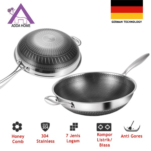 *Super recommend!!! Jamin beli ngak bakal nyesel!- Teknologi Jerman- Ukuran Diameter Model A - 32cm Model B (Upgraded) - 34cm + Double sided Honey Comb (Teknologi Terbaru)- Bahan Stainless Steel 304- Sudah Termasuk Penutup Wajan- Anti Gores- Anti Karat- Anti LengketBahan Tutup wok pan-Kaca pada bagian tengah-Stainless di sampingnya..5 Hal Yang Terpenting Saat Anda Ingin Membeli Wajan / Frying Pan :1. Aman untuk kesehatan anda dan keluarga * Terbuat dari Bahan Stainless 304 yang berkualitas dengan kandungan Logam Kromium dan nikel yang tebal sehingga tidak mudah berkarat.2. Wajan yang Tahan lama * Terbuat dari 7 lapis berbagai jenis logam terbaik sehingga anda tidak perlu ragu untuk memasak dengan spatula apapun karena wajan dijamin anti gores.3. Wajan Anti Lengket* Teknologi Bahan yang terbaru dengan kombinasi 7 logam sehingga tidak lengket pada waktu menggoreng makanan yang mudah lengket seperti ikan, telor dan lainnya.4. Wajan yang bisa mendistribusikan panas dari kompor secara merata sehingga memasak menjadi lebih mudah, cepat dan menggoreng tidak mudah gosong.5. Cara perawatan yang sangat mudah karena makanan tidak lengket dapat dicuci dengan sponge pembersih yang diinginkan.Cara membersihkan wajan sebelum digunakan:Step 1 - Sebelum digunakan dicuci dengan sabun dan air sperti biasaStep 2 - Pastikan wajan kering lalu oleskan minyak hampir di sekeliling permukaan wajan (hanya dioleskan saja ya bukan minyak yg penuh) dan diamkan dengan api sedang sampai ada sedikit asap keluar.Step 3 - Sebelum api dimatikan lap wajan dengan kain tebal pd bagian berminyak lalu matikan api, setelah itu cuci dengan sabun dan air seperti biasa.Step 4 - Step 2 dan 3 di ulang 2-3 kali dan wajan siap digu
