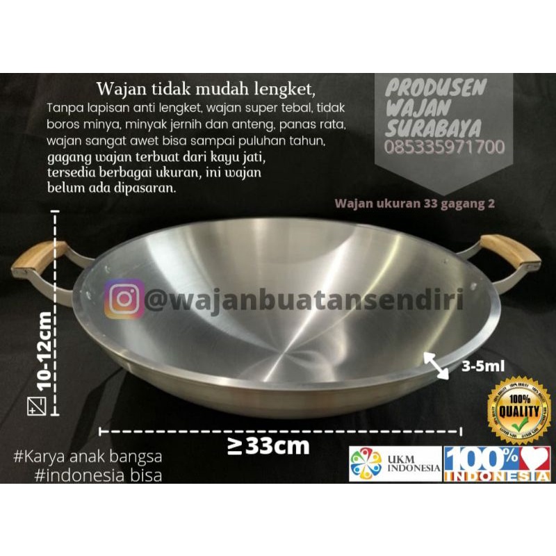 WAJAN / KUALI/ PENGGORENGAN SUPER TEBAL HIGH QUALITY ( PREMIUM ) 33cm gagang 2@wajanbutansendiriprodusen wajan surabaya UKURAN 33Diameter : 33cmWAJAN / KUALI/ PENGGORENGAN SUPER TEBAL HIGH QUALITY ( PREMIUM ) 33cm gagang 2kenapa harus beli wajan kami?1.wajan sangat tebal2.awet puluhan tahun3.tidak mudah lengket tanpa bahan anti lengket4.gagang wajan terbuat dari kayu jati5.tidak boros minyak / minyak jernih dan anteng6. warna wajan cerah sehinggah memudahkan kita mengontrol makanan saat kemasukan kotoran diwaktu menggoreng7. super premium sangat tebal8. bagian bawah wajan datar atas wajan cekung sehingga tidak , jadi bisa anteng saat ditaruh9. tidak kalah dengan teknologi teflon10. buatan sendiri / produk dalam negridan belum ada dipasaranWAJAN / KUALI/ PENGGORENGAN SUPER TEBAL HIGH QUALITY ( PREMIUM ) 33cm gagang 2TERSEDIA WAJAN BUATAN SENDIRI / PRODUKSI SENDIRI, TIDAK MUDAH LENGKET TANPA BAHAN ANTI LENGKET, SANGAT TEBAL, TIDAK KALAH DENGAN TEKHNOLOGI TEFLON, PEGANGAN WAJAN DARI KAYU JATI, TIDAK BOROS MINYAK DAN TIDAK MUDAH GOSONG.INI WAJAN BELUM ADA DI PASARAN. MADE INDONESIA YUK BERALIH KE WAJAN PRODUKSI DALAM NEGRI TIDAK KALAH BAGUS KUALITASNYA. AWET DAN ISTIMEWAH .TERSEDIA VARIASI PEGANGAN, ADA PEGANGAN MODEL KUPINGAN, ADA PEGANGAN MODEL NASI GORENG. BAWAH WAJAN DATAR, BAHAN DARI ALUMINIUM MURNI YANG BAGUS DAN TEBAL.WAJAN / KUALI/ PENGGORENGAN SUPER TEBAL HIGH QUALITY ( PREMIUM ) 33cm gagang 2[ INI WAJAN BELUM ADA DIPASARAN ]#wajan #antilngket #wajanantilengket #frypan #pan #teflonrecommended SUPER AWET SANGAT TEBAL BISA AWET PULUHAN TAHUN KUALITAS