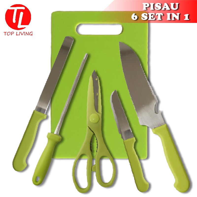 Satu set cukup untuk melakukan berbagai kegiatan memasak. Memliki mata pisau yang berbahan stainless sehingga tajam dan aman digunakan. Talenan berbahan plastik berkualitas memiliki ukuran yang pas serta anti slip. Set Peralatan masak mudah dibersihkan dan tahan lama.Isi set>1 buah pisau pemotong daging>1 buah pisau pemotong sayur>1 buah pisau kue>1 buah gunting>1 buah talenan>1 buah pengasah