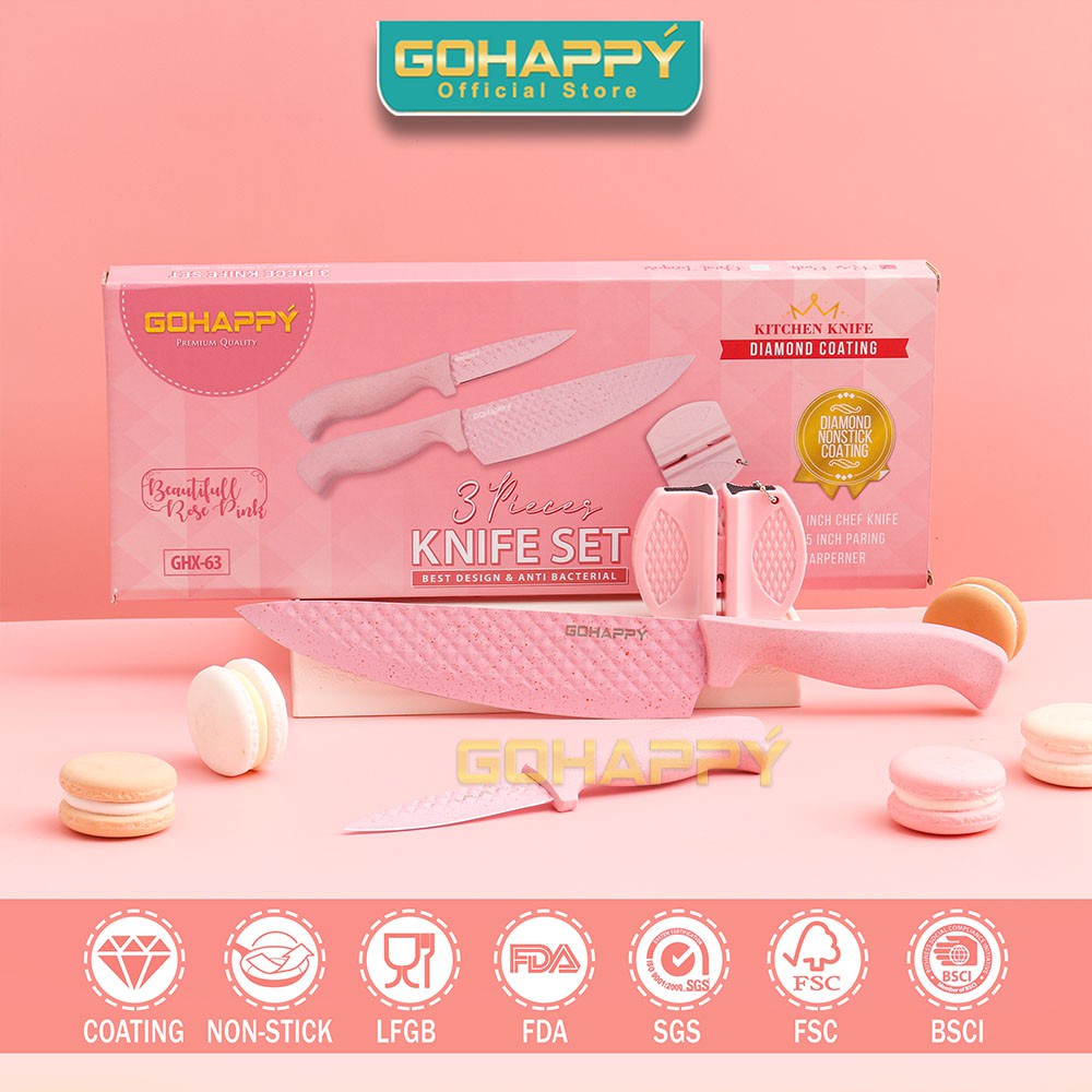 Knive Set Diamond 3 pc Pisau set anti lengket Grid DiamondPisau set Diamond 3 in 1 Dari Gohappy dengan tampilan Diamond coating yang cantik dan berfungsi memotong apapun tidak menempel dipisau, jadi memotong apapun lebih mudah dan tidak menempel di pisaunyaPisau diamond gohappy 3 in 1 Stainless Steel knives set TERDIRI DARI:- Chef Knife pisau serbaguna untuk mengiris buah sayur ,memotong daging/ikan/ayam- Paring knife pisau mengupas kulit buah sayur dan memotong makanan kecil- Pengasah pisau (baja & ceramic sharpener)Cara Pemakaian pisau dan pengasah pisaunya- hindari mencuci dengan sabut stainless, coating non stick bisa terkelupas- Tidak bisa untuk potong tulang.- CARA MENGASAH PISAU Dengan menggunakan pisau diamond : hanya 1 gerakan, tidak boleh maju mundur maju mundur yaa, membuat pisau tidak tajam. Inget, Mundur mengasahnya.Note: Mengasah pisau: 10x asahan baja dilanjut 10x asahan ceramic untuk menghaluskan pisaunya. Pisau kembali tajam sempurna! Jika dirasa kurang tajam, bisa diulangi lagiHappy Shoppi