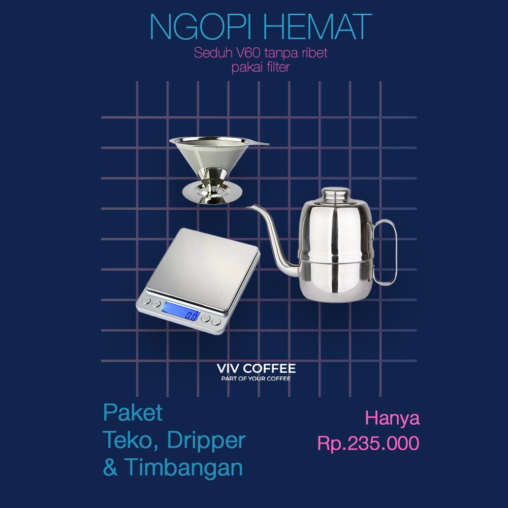 GRATIS BONUS KOPI SELAMA PERSEDIAN MASIH ADAApakah kamu salah satu yang baru memulai menikmati kopi? namun masih merasa bingung dengan metode seduh dan juga alat-alat yang digunakan? Tenang saja,kami memiliki solusi untuk kamu yang baru saja menyukai kopi ataupun sudah menyukai kopi dan ingin menambah koleksi alat seduhanmu.Kami berikan paket lengkap metode seduh V60 Pour Over yang hemat untuk kamu,dan selanjutnya yang kamu lakukan hanya tinggal seduh kopimu sendiri.Paket ini terdiri dari : ✓ 1 buah Teko Leher Angsa 520ml✓ 1 buah Dripper Stainless size 01 bisa untuk 2-4cups dan kamu tidak perlu menggunakan kertas saring kopi lagi✓ 1 buah Timbangan Kapasitas 1kg Ayo mulai menikmati kopimu sendiri,dimanapun dan kapa