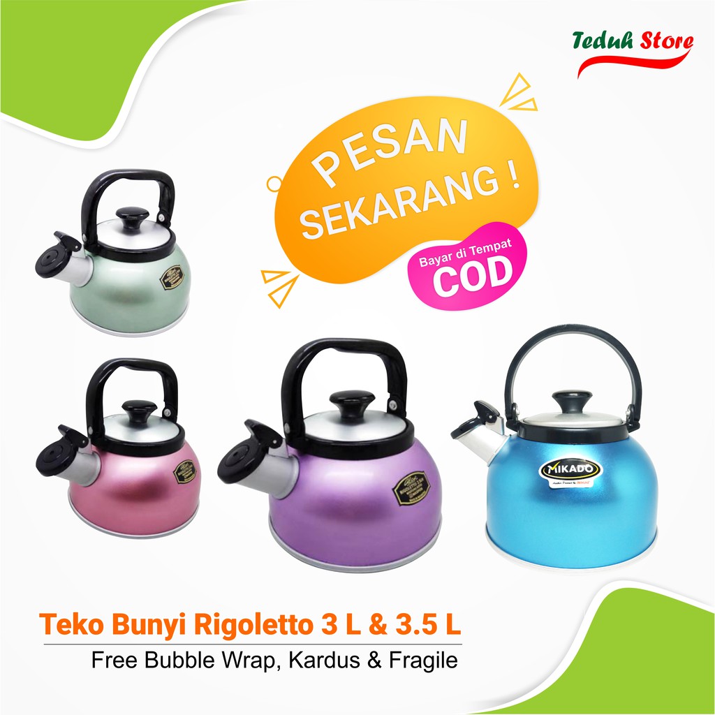 Teko Siul Whistling Kettle Maspion Rigoletto 3 liter (Produk Alcon / Maspion Group)- bunyi ketika air matang (produk tidak ditest bunyi, dikirim "sebagaimana adanya" dari pabrik Maspion)- kapasitas 3 liter- bahan bukan aluminium biasa tetapi oxide aluminium yang keras dan lebih tahan goresan (bukan lapisan coating)Kettle anodized ini merupakan teknologi dari Jepang yang banyak digunakan dalam pembuatan alat-alat masakPilihan Warna : Gold, Pink, Green, Violet, Blue, WhiteDikirimkan sesuai stokKeunggulan :- tidak lengket- tahan terhadap goresan- tidak karatan- tahan terhadap asam dan garam- mudah dibersihkan- warna kettle tetap cemerlang- hemat energy karena cepat panas- tidak beracunready stok, silahkan boron